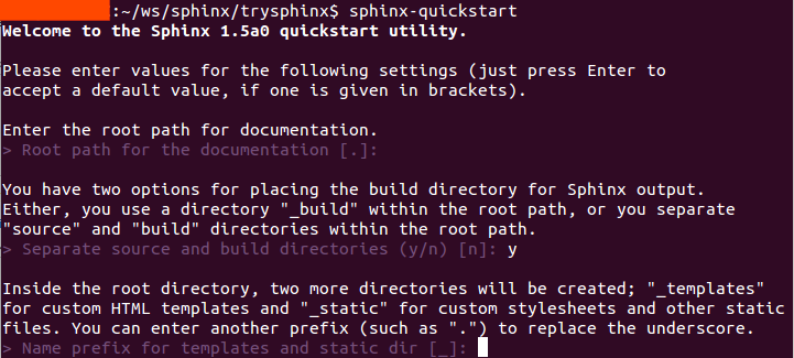 在你的磁盘里新建一个工作目录, 比如我在用户主目录下的 ws 文件夹中建立了个 sphinx 目录, 又在其中建立了一个 trysphinx 目录用于本次演示, 即 ws/sphinx/trysphinx , 然后切换到此目录并启动 sphinx 以创建并配置工程, 整个过程命令表示如下 (注意: 仅输入终端命令提示符 $ 后面的代码)